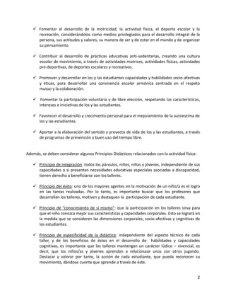 Este documento presenta las orientaciones y requisitos para la postulación de proyectos de talleres deportivos y recreativos en establecimientos educacionales. Los proyectos buscan promover la actividad física y formación integral de los estudiantes. Los establecimientos deben cumplir ciertos requisitos como tener una matrícula mínima y un índice de vulnerabilidad escolar superior a cierto puntaje. El financiamiento máximo por proyecto varía entre $800.000 y $1.500.000 dependiendo del tipo de establecimiento.