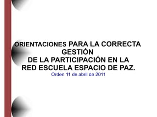 Este documento proporciona orientaciones para la gestión de la participación en la Red Escuela Espacio de Paz en Andalucía. Detalla los requisitos de inscripción, el nombramiento y funciones del coordinador, los ámbitos de actuación, los compromisos de los centros participantes y los criterios para el reconocimiento como centro promotor de convivencia positiva.