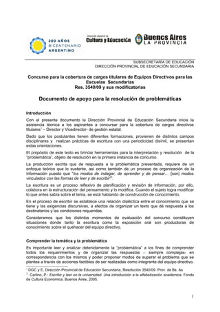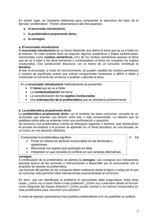 Este documento presenta orientaciones para la interpretación y resolución de "problemáticas" en el concurso para cubrir cargos directivos en escuelas secundarias. Explica que una problemática contiene un enunciado introductorio, la descripción de la problemática y una consigna. Proporciona ejemplos de tres problemáticas tipo y describe los componentes de cada una. El objetivo es ayudar a los aspirantes a comprender mejor las problemáticas y producir respuestas escritas sustentadas.