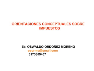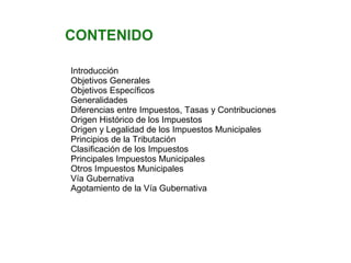 Este documento trata sobre conceptos tributarios generales. Explica las diferencias entre impuestos, tasas y contribuciones, el origen histórico de los impuestos y la legalidad de los impuestos municipales. También cubre principios de tributación como equidad, eficiencia y progresividad. Finalmente, resume varios impuestos municipales principales como el impuesto de industria y comercio y el impuesto predial unificado.