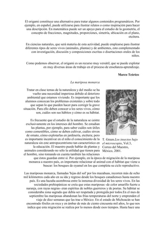 Este documento presenta una actividad de origami para hacer figuras de la mariposa monarca y el árbol de oyamel con el objetivo de enseñar a los estudiantes sobre la migración de la mariposa monarca y la importancia de proteger su hábitat. Explica cómo hacer las figuras de origami con papel y botellas de plástico recicladas, y sugiere usar las figuras para generar conciencia sobre los problemas ambientales que enfrenta la mariposa monarca.