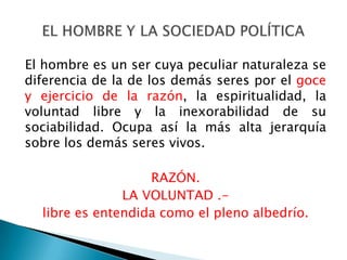 El documento describe la naturaleza humana y su posición superior a otros seres vivos debido a su capacidad de razón, espiritualidad, voluntad libre y sociabilidad inevitable. Explica que los seres humanos son gregarios y dependen de la sociedad para desarrollarse plenamente.