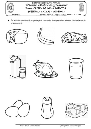 El documento proporciona una tarea para un estudiante de nivel inicial que requiere identificar el origen de varios alimentos como vegetal, animal o mineral. Se pide al estudiante encerrar en un círculo los alimentos de origen vegetal, colorear los de origen animal y marcar con una x los de origen mineral.