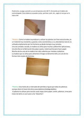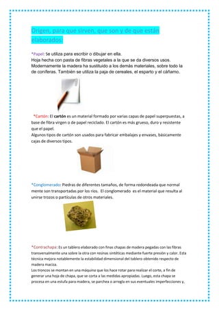 El documento define y describe los orígenes y usos de varios materiales comunes como el papel, cartón, madera, plástico, hojalata, tela y diferentes tipos de desechos. El papel y el cartón se hacen de fibras vegetales. La madera y el contrachapado se usan ampliamente en la construcción. El plástico y la hojalata se usan comúnmente para envases. Los desechos radiactivos, tóxicos e inflamables requieren un manejo especial debido a los riesgos que representan.