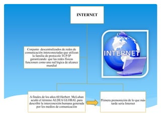 Este documento describe el origen e historia de Internet desde sus inicios en la década de 1960 hasta la actualidad. Comenzó como una red académica y militar llamada ARPANET en Estados Unidos, y evolucionó para incluir el correo electrónico, protocolos como TCP/IP, y redes más amplias como NSFNET. En la década de 1990, surgió la World Wide Web y los primeros sitios comerciales como Amazon y eBay. En los 2000, las redes sociales como Facebook y YouTube revolucionaron Internet, y los dispositivos móviles pasaron a ser