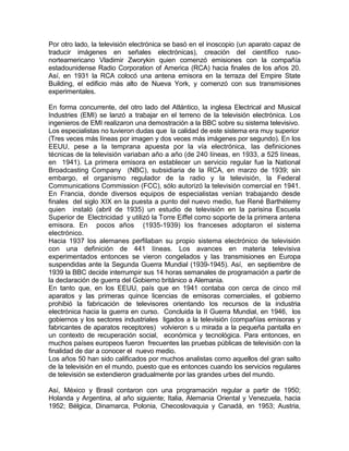 La televisión surgió a finales del siglo XIX como la conjunción de tres descubrimientos: la fotoelectricidad, el análisis de fotografías en líneas de puntos y la transmisión de señales eléctricas a través de ondas hertzianas. En los años 20 surgieron dos modelos: la televisión mecánica de John Baird y la electrónica de Vladimir Zworykin. Aunque ambas se desarrollaron de forma paralela, la definición de imagen de la electrónica era superior. En las décadas sigu