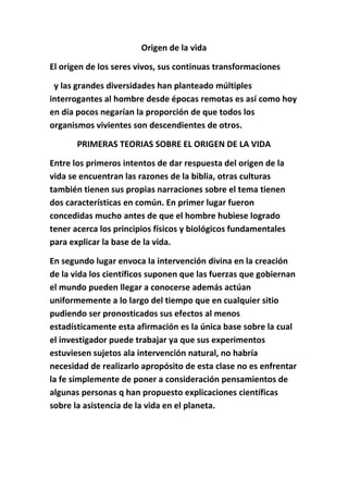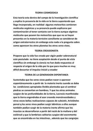 El documento presenta varias teorías sobre el origen de la vida. Inicialmente se mencionan las primeras teorías como las de la Biblia o las de otras culturas antiguas que involucraban la intervención divina. Luego se describe la teoría cosmozoica que sugiere que la vida llegó a la Tierra a través de meteoritos. También se menciona brevemente la teoría creacionista y la teoría de la generación espontánea, la cual proponía que los seres vivos podían surgir espontáneamente de la materia in