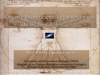 El documento describe el origen y evolución de la vida en la Tierra desde el Big Bang hasta la formación de la especie humana. Explica las teorías creacionista, abiogenética y panspermia sobre el origen de la vida, y los experimentos de Redi, Pasteur y Miller-Urey que apoyaron la teoría de que la vida proviene de otra preexistente. También describe la aparición de las primeras células a partir de moléculas orgánicas en un "caldo primitivo", con material genético, membrana y metabolismo,