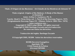El documento resume la genealogía de los tres hijos de Noé (Sem, Cam y Jafet) según el capítulo 10 de Génesis. Explica cómo sus descendientes se dispersaron por el mundo y dieron origen a las tres principales líneas raciales actuales (caucásicos, negroides y mongoloides). Además, analiza las conexiones entre los nombres mencionados y diferentes pueblos y regiones del mundo antiguo y moderno. Finalmente, destaca la unidad de la raza humana y cómo Cristo vino a salvar a los descendientes de