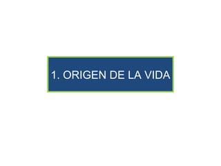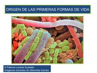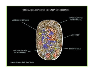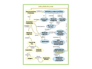 Este documento describe el origen de la vida y las primeras células. Explica que la vida probablemente comenzó como ARN autorreplicativo rodeado de una membrana de fosfolípidos. Luego evolucionaron las células procariotas, que eventualmente dieron lugar a las células eucariotas a través de endosimbiosis con bacterias que se convirtieron en mitocondrias y cloroplastos. Los fósiles más antiguos de células datan de hace 3500 millones de años.