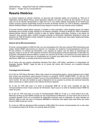 Este documento resume la historia y evolución de los computadores desde las primeras máquinas mecánicas de cálculo en el siglo 17 hasta los microprocesadores modernos. Detalla hitos clave como las tarjetas perforadas de Hollerith en la década de 1880, el primer microprocesador 4004 de Intel en 1971, el primer microcomputadora personal Altair 880 en 1975 y el desarrollo de los primeros PC de IBM, Apple y otros. También describe las mejoras en procesamiento y capacidad a lo largo de las décadas de 1980 y 1990 a med
