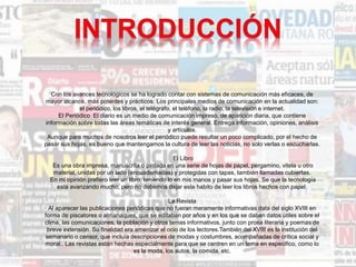 Este documento describe la evolución de varios medios de comunicación tradicionales como los periódicos, libros y revistas. Explica que los periódicos son publicaciones impresas que contienen noticias e información actualizada de manera diaria o semanal. Las revistas se enfocan en temas específicos como moda, deportes o política y son publicadas con una periodicidad semanal, quincenal o mensual. Los libros son obras impresas o manuscritas encuadernadas que permiten una lectura más profunda sobre un tema.