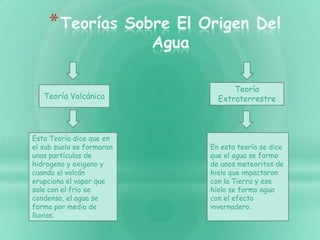 El documento presenta dos teorías sobre el origen del agua en la Tierra: la teoría volcánica, que sugiere que el agua se formó a partir de partículas de hidrógeno y oxígeno en el subsuelo que se condensaron durante erupciones volcánicas, y la teoría extraterrestre, la cual propone que meteoritos de hielo impactaron la Tierra y ese hielo se convirtió en agua debido al efecto invernadero. El agua llegó a nosotros a través del ciclo del ag