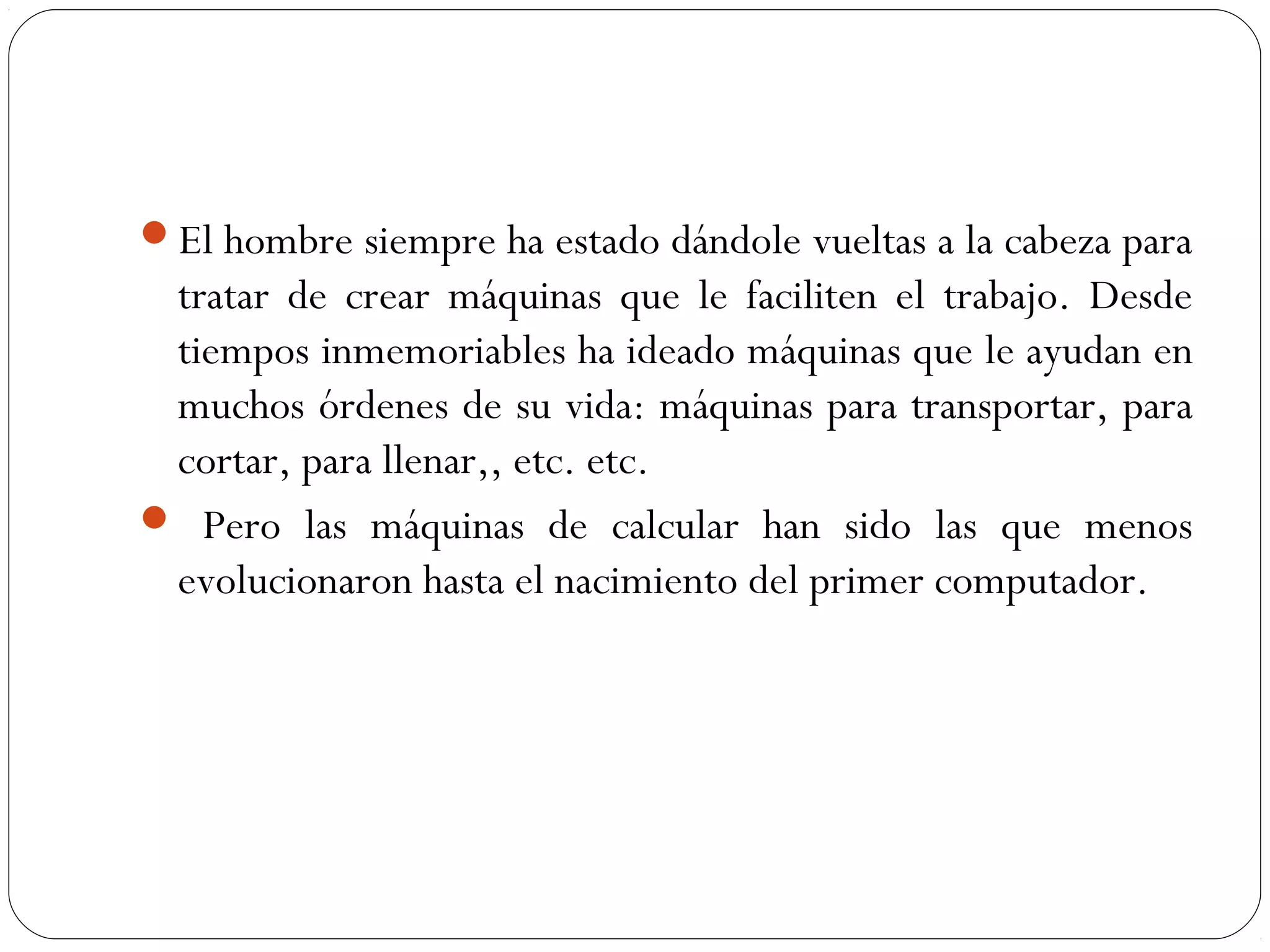 El documento describe la evolución de los computadores desde tiempos antiguos hasta la quinta generación. Comenzó con dispositivos mecánicos para contar como el ábaco en el 2600 AC en China. Luego evolucionaron las máquinas de calcular mecánicas en el siglo 17. En la primera mitad del siglo 20 se desarrollaron las primeras computadoras electromecánicas y electrónicas como la ENIAC y UNIVAC. Las generaciones posteriores introdujeron los transistores, circuitos integrados y microprocesadores, llevando al