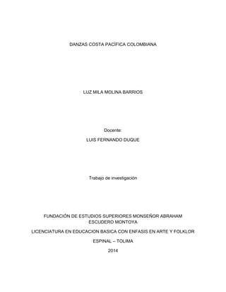 Este documento describe las danzas tradicionales de la costa pacífica de Colombia, incluyendo su origen, instrumentos musicales, vestuario y características. Se centra en cinco danzas principales de la región de Chocó: el bundes, la mazurca, la moña y el tamborito. También describe los instrumentos musicales que acompañan estas danzas, como la chirimía, el clarinete y el bombardino. Explica que estas danzas tienen raíces tanto europeas como africanas, y cómo los esclavos afric