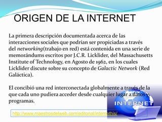 El documento describe el origen e historia de Internet. Comenzó en 1962 con la idea de una "Red Galáctica" propuesta por J.C.R. Licklider. Luego, en 1969, el gobierno de EE.UU. creó ARPANET para permitir que los ordenadores se comunicaran incluso si algunos fueran destruidos. En 1973, Vint Cerf y Robert Kahn desarrollaron TCP/IP, el protocolo fundamental de Internet. El World Wide Web, desarrollado en 1991, hizo que Internet fuera accesible para todos.