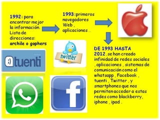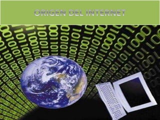 Este documento describe el origen e historia de Internet. Se remonta a la década de 1960 cuando ARPA (ahora DARPA) buscaba mejorar la forma de usar computadoras al conectar redes locales a través de puertas o gateways. Internet ha crecido rápidamente y ahora es una importante fuente de información, comunicación y colaboración para profesionales, estudiantes y pacientes.