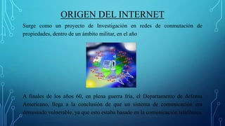 El documento describe el origen e historia del Internet. Hace 45 años, el Departamento de Defensa de EE.UU. creó la red ARPAnet para establecer un sistema de comunicación más seguro y fiable. ARPA desarrolló la tecnología de conmutación de paquetes para asegurar que la información llegara a su destino aunque partes de la red fallaran. Gracias a esta innovación, el Internet creció rápidamente y se convirtió en la mayor red de computadoras del mundo, transformando para siempre la manera en que las personas se comunican.
