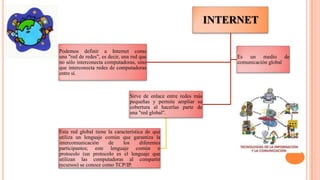 El documento proporciona una historia de Internet, describiendo su origen como una red militar estadounidense llamada ARPANET en la década de 1970 y su evolución hacia una red global de comunicaciones. Explica que Internet conecta redes de computadoras a través del protocolo TCP/IP y describe brevemente el desarrollo de la World Wide Web por Tim Berners-Lee en la década de 1990. Concluye resumiendo los usos comunes de Internet como correo electrónico, entretenimiento e investigación, y su importancia en la vida cotidiana y el trabajo