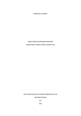 El documento describe el origen e historia del Internet. Se originó en 1969 como una red militar estadounidense llamada ARPANET que conectaba centros de investigación. Luego se expandió a universidades y otros centros académicos. En los años 80 los usuarios eran principalmente científicos y curiosos. Actualmente el Internet es una red descentralizada global que usa protocolos TCP/IP y permite servicios como correo electrónico, web y redes sociales.