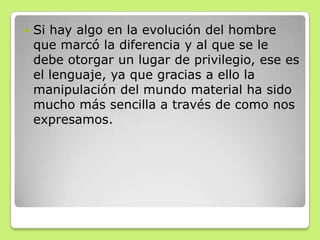 El documento trata sobre el origen y desarrollo del lenguaje. Explica que el lenguaje ha permitido a los seres humanos manipular el mundo de forma más sencilla y que se desarrolla principalmente en los primeros cinco años de vida a través de la adquisición de formas lingüísticas y contenidos. También resume las teorías conductista, de Noam Chomsky, Piaget y Vygotsky sobre la adquisición y desarrollo del lenguaje.
