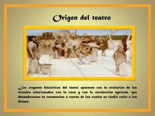 El documento resume la historia del teatro desde sus orígenes en rituales religiosos hasta el teatro contemporáneo. Comenzó como poesía dramática dedicada a dioses y luego reflejó conflictos humanos. Se desarrollaron las tragedias, comedias y dramas, con exponentes como Sófocles, Eurípides y Aristófanes en la antigüedad. El teatro medieval era de calle y patrocinado por la iglesia. El renacentista fue más naturalista. El siglo XX trajo diversificación de estilos evolucionando con las v