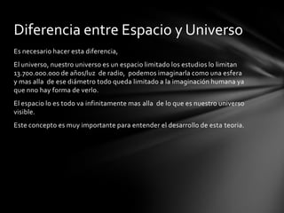 El documento discute la teoría del universo homogéneo, diferenciando entre el espacio y el universo, y afirmando que el universo visible tiene un límite de 13.7 mil millones de años luz. Describe un estado primitivo del universo sin materia como la conocemos, donde todo era una matriz homogénea de partículas primarias que eventualmente se aglutinaron, desencadenando el Big Bang y la formación de la materia y la energía. Finalmente, se postula que el universo busca su tamaño original a medida que la materia se desintegra en materia oscura, lo que genera la sensación de expansión.