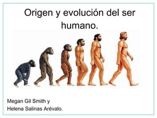 Este documento resume el origen y evolución de la especie humana. Explica que los seres humanos descendemos de primates que evolucionaron hace millones de años a través de procesos de selección natural y mutación genética. Detalla las principales etapas del proceso de hominización, incluyendo cambios anatómicos que permitieron la postura erguida y fabricación de herramientas. Además, destaca que pese a las diferencias superficiales, todos los humanos pertenecemos a la misma especie debido a nuestro 99