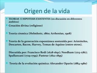 El documento describe varias teorías sobre el origen de la vida. La teoría más aceptada es que la vida comenzó a partir de moléculas sencillas como cadenas de ARN capaces de autoreplicarse llamadas ribozimas. Estas moléculas primigenias eran más resistentes de lo pensado y podrían haber evolucionado hasta formas de vida más complejas con cientos de genes, lo suficiente para los primeros organismos.