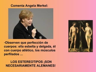 Los líderes de la UE visitaron el Museo del Louvre después de una reunión estresante y se detuvieron frente a la pintura de Adán y Eva. Angela Merkel comentó que los cuerpos perfectos parecían alemanes, mientras que François Hollande argumentó que el erotismo sugería que eran franceses. David Cameron opinó que la serenidad de sus rostros parecía inglesa, pero Mariano Rajoy no estuvo de acuerdo y dijo que el hecho de que no tuvieran ropa ni zapatos y pensaran que estaban en el para