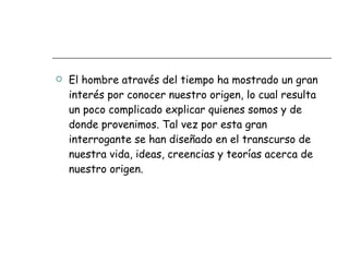El documento presenta varias teorías sobre el origen de la vida: 1) la generación espontánea, que sugiere que la vida puede surgir de materia inerte; 2) la panspermia, que propone que la vida llegó a la Tierra en meteoritos; y 3) la teoría biogenética, que contradice la generación espontánea basándose en experimentos. También describe la teoría de la evolución química de Oparin y Haldane, la cual explica cómo a través de reacciones químicas en el mar primitivo