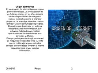 El documento describe el origen y desarrollo de Internet. Se originó en la década de 1960 cuando el gobierno de Estados Unidos financió proyectos para desarrollar un sistema de comunicación descentralizado y resistente para uso militar. Más tarde, esta red evolucionó para permitir el intercambio de información entre computadoras conectadas. La World Wide Web apareció en 1994 permitiendo a los usuarios acceder e interactuar con contenido en línea de forma dinámica.