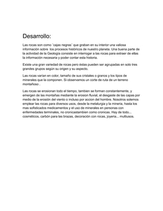 Este documento describe los tres tipos principales de rocas: ígneas, sedimentarias y metamórficas. Las rocas ígneas se forman por la consolidación de magma y se dividen en plutónicas, volcánicas y filonianas dependiendo de dónde se enfríen. Las rocas sedimentarias se forman por la acumulación de sedimentos y incluyen rocas detríticas, químicas y orgánicas. Las rocas metamórficas se forman a partir de otras rocas por procesos de metam