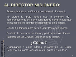 Este documento ofrece consejos a un director de ministerio personal sobre cómo liderar un grupo pequeño de líderes de grupos pequeños en la iglesia. Sugiere organizar a los líderes en un grupo pequeño para pastorearlos y capacitarlos, siguiendo el ejemplo de Jesús con sus discípulos. También recomienda que el director pase una semana a solas con Dios para prepararse espiritualmente antes de asumir este liderazgo.