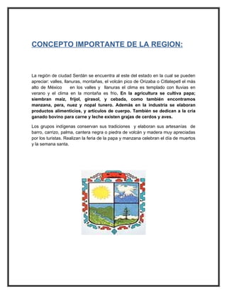 Este documento proporciona información sobre la región de Ciudad Serdán en el estado de Puebla, México. Describe la ubicación, clima, actividades económicas como la agricultura y ganadería, y grupos indígenas de la región. También incluye detalles sobre la historia, tradiciones y festividades de Ciudad Serdán.