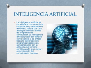 Este documento presenta información sobre inteligencia artificial. Explica que la inteligencia artificial es una rama de la computación que intenta crear programas de computadora inteligentes mediante el uso de técnicas como aprendizaje automático y razonamiento. También describe diferentes tipos de inteligencia artificial como sistemas que piensan como humanos y sistemas que actúan racionalmente.