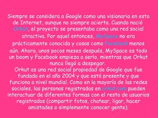Orkut comenzó como un proyecto secundario en Google pero luego fue adquirido por la compañía. Aunque Orkut tuvo éxito inicialmente como una red social, nunca logró despegar realmente y ahora ha perdido popularidad frente a redes como Facebook y MySpace. Google ha integrado varias herramientas en Orkut como Google Talk para mejorar la experiencia pero la red social sigue sin despegar.