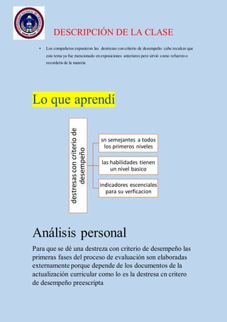 Los compañeros expusieron destrezas con criterios de desempeño que ya habían sido mencionados en clases anteriores, sirviendo como refuerzo del tema. Para que una destreza tenga un criterio de desempeño, las primeras fases del proceso de evaluación son elaboradas externamente y dependen de documentos como la actualización curricular.