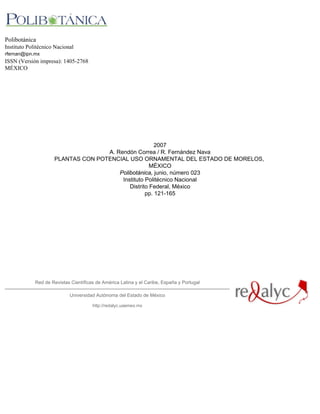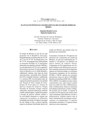 Este documento presenta una lista de 179 especies de plantas con potencial uso ornamental en el estado de Morelos, México. Las familias con mayor número de especies fueron Compositae con 30 especies, Leguminosae con 18 especies y Labiatae y Burseraceae con 6 especies cada una. Se establecen cuatro valores ornamentales potenciales para cada especie: flor o inflorescencia, fruto o infrutescencia, forma y estructura de la planta, y hojas o follaje. 90 especies se destacan por su flor o inflorescencia, 1