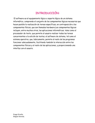 El documento habla sobre el software. Explica que el software son los programas que controlan la actuación del computador y hacen que siga esquemas lógicos predeterminados. Además, clasifica el software en diferentes categorías como software de sistema, software de aplicaciones, software de desarrollo y más. También describe algunos tipos específicos de software como los sistemas operativos, procesadores de texto, hojas de cálculo y otros. Por último, menciona los avances recientes del hardware y software.
