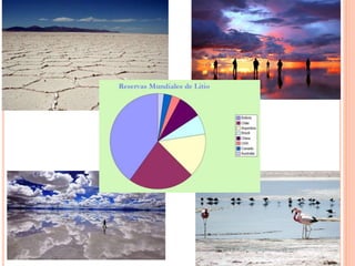 El documento describe las propiedades y usos del litio, un metal blando de color blanco plata que se encuentra comúnmente en salares. El litio se extrae principalmente de salmueras en el "Triángulo del Litio" entre Argentina, Chile y Bolivia. En Chile, las mayores reservas se encuentran en los salares de Atacama y Surire. La producción de litio consta de tres etapas y las principales empresas productoras son SQM y SCL.