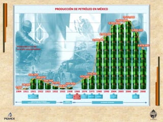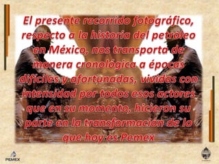 El documento resume la historia del petróleo en México desde 1899 hasta la actualidad, destacando hitos como el descubrimiento del pozo Cerro Azul No. 4 en 1916, la expropiación petrolera de 1938, y la creación de Pemex. Resalta la lucha de los trabajadores petroleros por sus derechos y la importancia estratégica del petróleo para México.