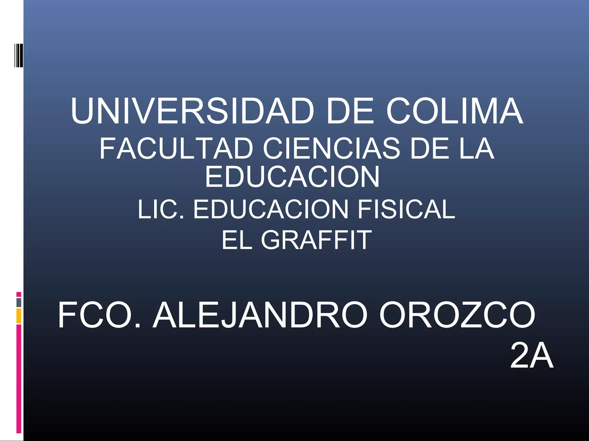 El documento resume la historia del graffiti en la ciudad de Tepic, México. Explica que los orígenes se remontan a los años 90 y los primeros grupos o "crews". Describe diferentes estilos de graffiti como "bombers o bubbles letters", "wild stile", "3D", "trow ups", "tag", y "geometrismo orgánico". Finalmente, presenta el marco jurídico relacionado con el graffiti y ofrece conclusiones sobre cómo el graffiti es visto como una forma de arte y expresión más que solo rayones sin significado.