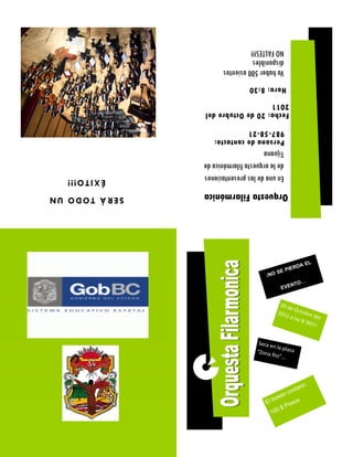 El documento anuncia un concierto de la Orquesta Filarmónica de Tijuana que se llevará a cabo el 20 de octubre de 2011 a las 8:30 pm en la "Zona Rio". Habrá 500 asientos disponibles y se espera que sea un gran éxito. Proporciona la fecha, hora y lugar del evento, así como un número de contacto para más información.