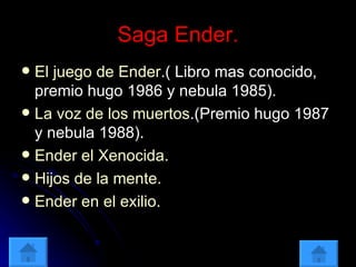 Orson Scott Card es un escritor estadounidense de ciencia ficción nacido en 1951. Su obra más conocida es la saga Ender, que comienza con la novela El juego de Ender, ganadora de los premios Hugo y Nebula. La saga continúa con novelas como La voz de los muertos y Ender el Xenocida, que exploran las consecuencias de las acciones de Ender Wiggin tras derrotar a los insectores.