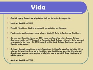 José Ortega y Gasset fue un filósofo y ensayista español influyente en el siglo XX. Nació en 1883 en Madrid, estudió filosofía y completó sus estudios en Alemania. Fundó varias publicaciones y tuvo gran influencia en la filosofía española con obras como La rebelión de las masas y Yo soy yo y mi circunstancia. Murió en Madrid en 1955.