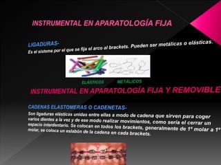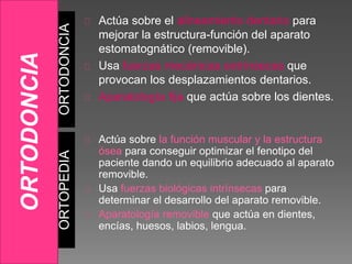 Este documento proporciona información sobre ortopedia y ortodoncia. Explica que la ortopedia actúa sobre la función muscular y estructura ósea para mejorar el alineamiento dentario mediante el uso de fuerzas biológicas intrínsecas, mientras que la ortodoncia usa fuerzas mecánicas extrínsecas aplicadas a través de aparatos fijos o removibles. También describe los diferentes tipos de maloclusiones dentales, sus causas, y los procedimientos y materiales utilizados en el tratamiento