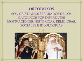 Las iglesias ortodoxa y católica se separaron por diferentes razones históricas, religiosas, sociales e ideológicas como la lengua utilizada, la organización de la iglesia, el uso del pan en la eucaristía y el celibato sacerdotal. La iglesia ortodoxa se organiza en torno a varios patriarcas mientras que la iglesia católica se organiza en torno al Papa en Roma. Los protestantes surgieron como movimientos reformistas de la iglesia católica en respuesta a crisis durante el