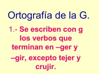 La ortografía de la letra G se escribe en palabras que terminan en -ger y -gir excepto tejer y crujir. También se escribe G al inicio de palabras que comienzan con geo, gest o gen excepto jengibre, y en palabras que terminan en -gen, -gia, -gio, -gión o -gional excepto lejía.
