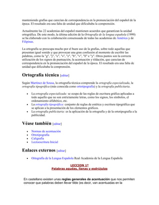 El documento habla sobre la ortografía. Explica que la ortografía establece las reglas para la escritura de letras y signos de puntuación. También indica que la ortografía se basa en convenciones aceptadas por una comunidad lingüística para mantener la unidad de la lengua escrita y que en países hispanohablantes la academia es la institución que regula estas convenciones. Por último, señala que la ortografía es un aspecto clave en la enseñanza y estandarización de un idioma.